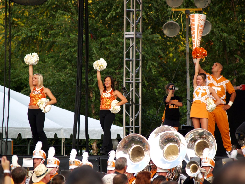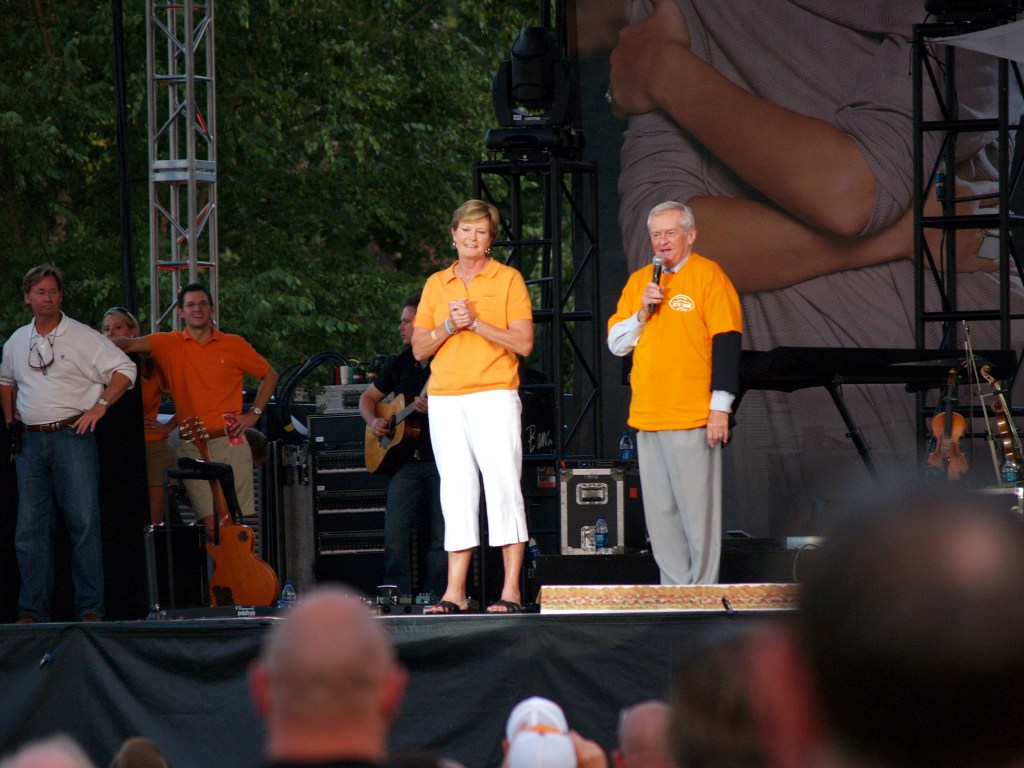 Pat Summit and John Ward pep up UT fans at an athletic department event.