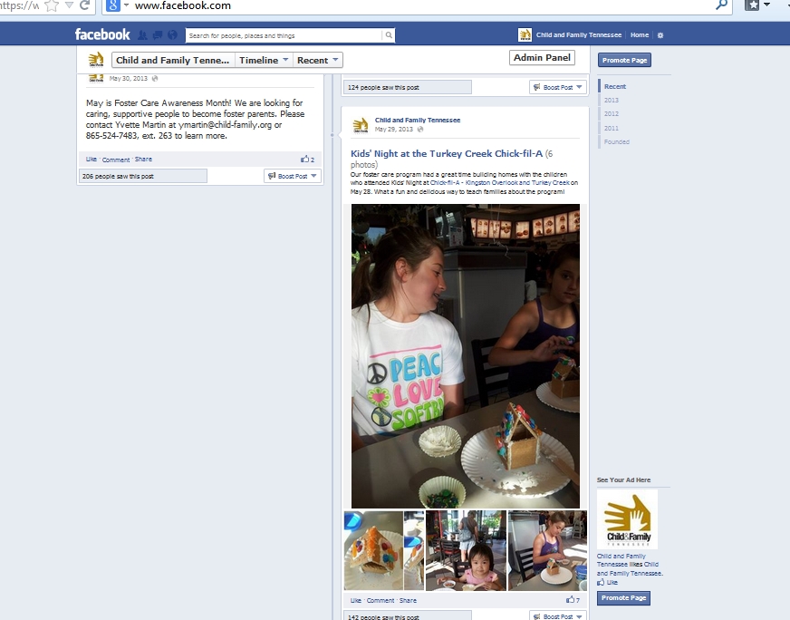 A Child & Family Tennessee facebook post from a foster care awareness event – “Building Homes for Families.” I came up with the idea to build homes out of graham crackers as a way to share the foster care awareness message.